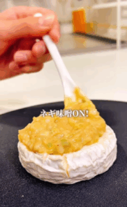 今回話題となった「ネギ味噌ふぉんでゅ」は、カマンベールチーズの上部の皮を切り取り、長ネギとみそ・砂糖・にんにく・マヨネーズ・一味唐辛子を混ぜたネギ味噌をのせてトースターで焼くだけ、という簡単レシピ。