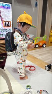 お兄ちゃんが寝ている隙にと思ったのか、リビングに持ってきて、次男くんは自分でリュックを背負い、帽子をかぶりました。