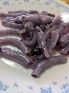 今回のパスタについても「材料の記憶は曖昧ですが、米粉、片栗粉、お水、ブルーベリーなどを混ぜました」と話します。