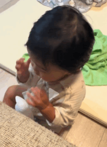 1歳6ヶ月になった現在は、保湿がよりレベルアップしたようで、顔に手を当て、激しく上下に動かして塗っているそうです。