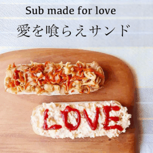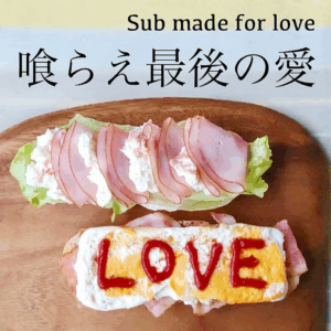 1つにはポテトサラダ・ハム・レタスが、もう1つにはベーコンエッグが入っており、その上にケチャップで「LOVE」と書かれています。