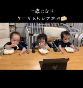動画には、はっきり3人いることがわかるエコー写真に始まり、ママさんのはち切れそうなお腹が映し出されます。その後、無事生まれた3人のかわいらしい赤ちゃんが、1歳になりケーキをわしづかみで食べる様子が映し出され、2歳になりイヤイヤ期を迎えます。さらに、しっかりとした3歳の様子やベビーカーに乗らなくなった4歳の様子、下に双子ちゃんが生まれお兄さんになった5歳お誕生日の様子などが次々と映し出されました。