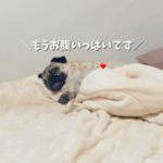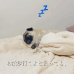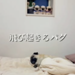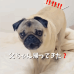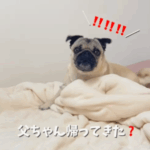 「父ちゃん帰ってきた」というとガバッと起き上がるももこちゃん(@momokopug.0822さんより提供)
