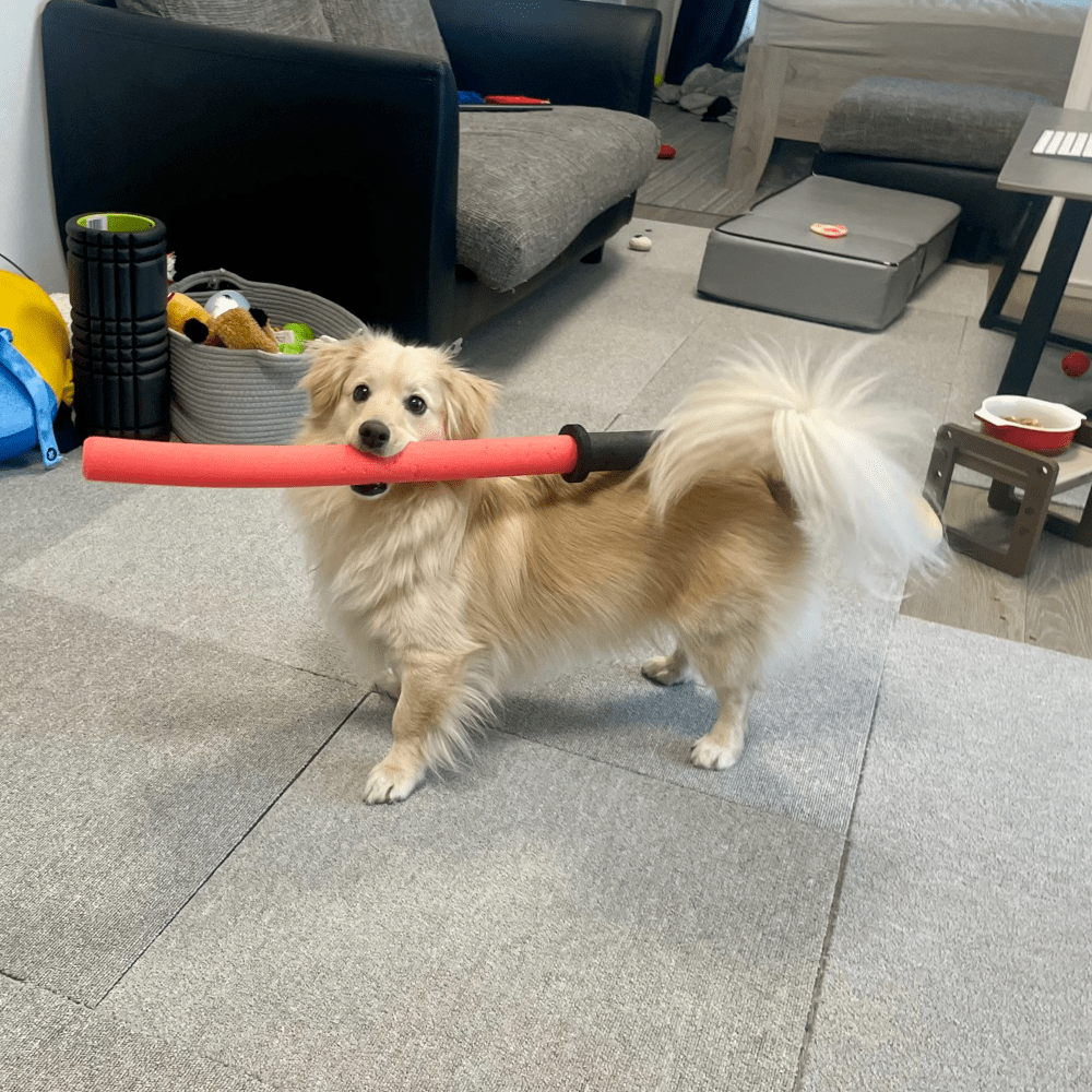 パパが100円ショップで買ったおもちゃの剣→愛犬に持たせた次の瞬間「どこでその剣を…」「なかなかやりおる」