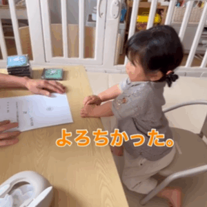 机を挟んで向かい合い「イヤイヤ期に入られるということでよろしかったでしょうか」とパパさんがお役所風に説明すると、娘さんは「よろちかった」と即答。