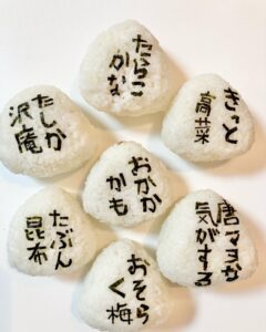 「たくあんかなぁ」「おかかかも」などの具材を表現した文字が、海苔を使って書かれているのです。