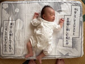 ブランケットに生後1ヶ月の息子さんを寝かせる前はドキドキし、寝かせた途端、なんともいえない愛おしさで膝から崩れ落ちたのだとか。