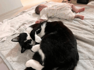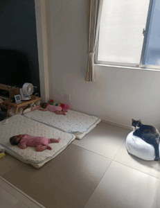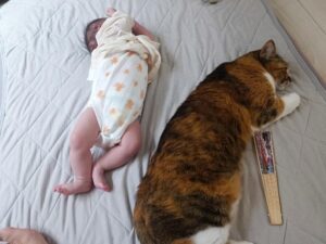 「赤ちゃんが寝たのでトイレに行き、戻ってきたらこの状態でした。2人の寝相とそれを見守る猫の配置が面白いなと思い、撮影しました」とママさん。