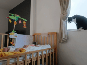 赤ちゃんが夜泣きをすると、もちまるくんも「ニャーニャー」と鳴き出してお気に入りのぬいぐるみをくわえて、家の中をウロウロする姿も見られるそうです。また、用事で赤ちゃんの側を離れていると、赤ちゃんが泣き出した際に、まるで「泣いてるよ」と伝えるかのように、呼びに来てくれることも。