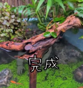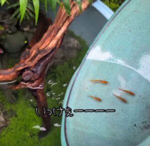 外に移動させると、水を入れて木を植えていきます。流木を置いたあと、小さなメダカたちを迎え入れました。