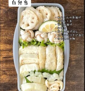 「みどり弁当」には、うどんや天ぷら、抹茶の卵焼きなど、すべて緑色のおかずが詰め込まれています。そして「白弁当」には、れんこんの天ぷらやちくわ、白い卵焼き。同じ卵焼きでも、味や焼き方を変えて色の違いを表現しているようです。