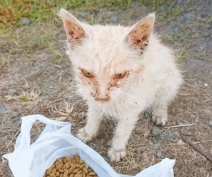 旦那さんから連絡を受けた@muni_muni0221さんは、なすくんのご飯を一握り分袋に入れて、駆けつけました。しかし、ねぎくんは口の中が荒れていて痛そうで、うまく食べられない様子でした。