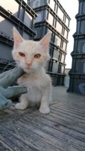 その後、ねぎくんはきれいに洗い、先住猫のなすくんが警戒していたため隔離しました。畑に行くときは連れて行き、子猫が体温調節できないことを考慮して、数日間懐に入れて温めながら作業していた@muni_muni0221さん。