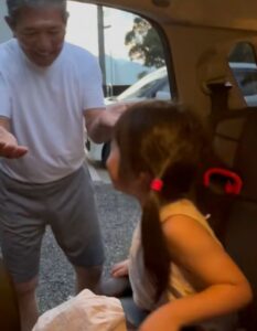 実家に着くと、おじいちゃんが車の外で待っていて、娘さんたちはうれしそうに降りる準備をします。