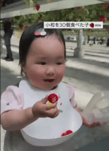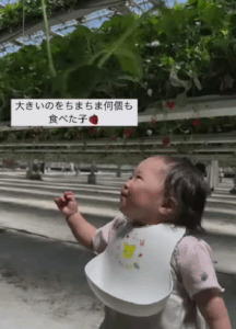 双子ちゃんはイチゴの高さにやっと届くほどの背丈ですが、大好きなイチゴに囲まれウキウキが止まらない様子。1人は大粒のイチゴを何個も食べ、もう1人は小粒のイチゴを30個も食べました。