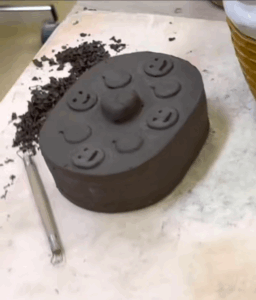 動画は、まだ完全に乾いていない円形の器をお弁当箱に成形する場面から始まります。完成品は黄色を基調とした仕上がりに。蓋にはトマトやスマイルマークの模様が描かれ、中央のツマミ部分はおにぎりになっていました。