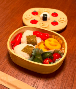 動画では実際に、おにぎりやトマトなどの食材が盛りつけられていました。スマイルマーク型にくり抜いたおかずも添えてあり、蓋を開けたときに「同じものが入ってた!」と笑顔になります。
