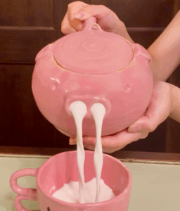 「牛乳を入れて注ぐと“鼻から牛乳〜”そのもので笑えます」と、説明してくれました。