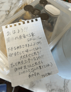 すると翌朝、テーブルの上にはお弁当と、次男さんのやさしい文字で書かれた手書きメモが。