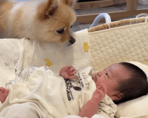 その後のポメくんは、娘さんの匂いをひたすら嗅いで、不思議そうな様子。そして、赤ちゃんを守るように側から離れようとしませんでした。