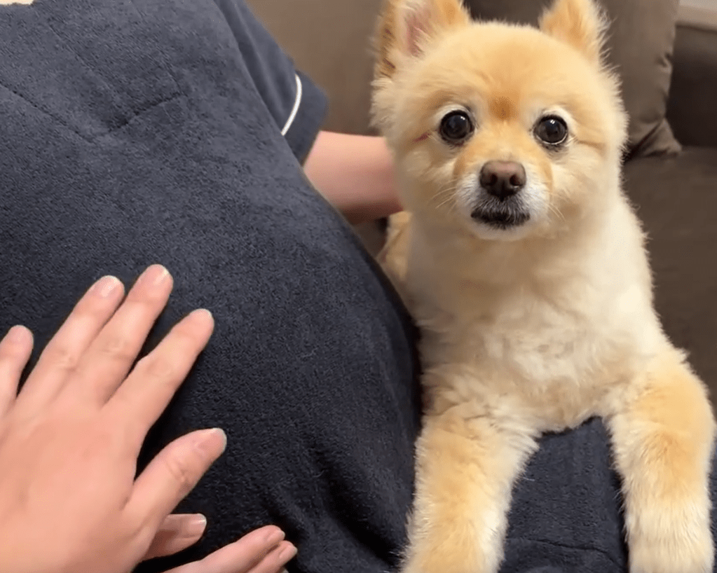 いつものようにポメくんと一緒にくつろいでいたとき、パパさんがママさんのお腹を触ろうとすると、突然ポメくんが豹変!