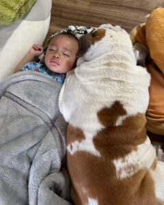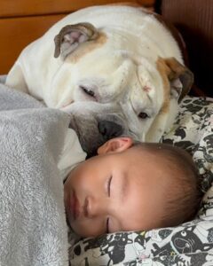 イングリッシュブルドッグのぬたろうくんと暮らす@nutastagram_bullさん。ある日、遊びに来ていた1歳8ヶ月の甥っ子くんをお母さんが寝かしつけていると、2人一緒にぐっすりと眠ってしまいました。