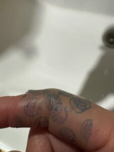 たしかに、ママさんの人差し指を見ると、青い模様のようなもの見えます。見方によってはタトゥーに見えないこともありません。