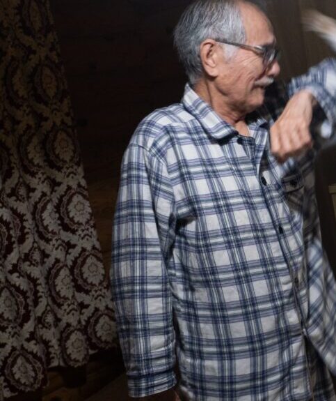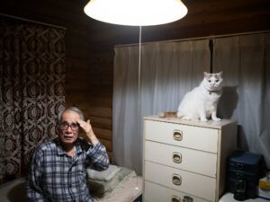 チェストの上にのっているのは、14歳のメイくん。隣には、パジャマ姿のお父さんが立っています。メイくんは、@marco74444さんの両親の寝室で寝ているため、何となく撮影しようと思って撮ったといいます。