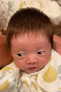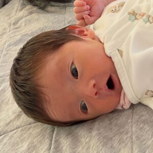 パパさんが生まれたばかりの娘さんを見たとき「髪型、完成している…!」と衝撃を受けました。娘さんの髪の毛は綺麗な栗色でメッシュが入っているかのようです。