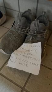 靴の上に貼り紙が…