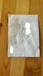 仕事から帰宅すると、ドアノブに大きな袋があり「何だろう?」と中を覗いてみると、土のついたサニーレタスが2株と「生食でどうぞ。◯◯より(大家さんの名前)」と書かれた手書きのメモが添えられていました。