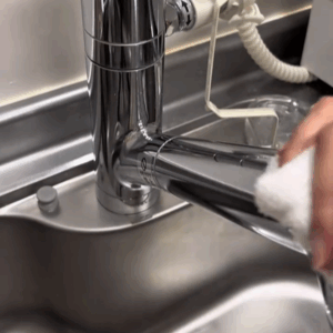 保冷材の端っこをハサミで切り、そのままスポンジにつけてシンクや水道栓を磨けば、気になる水垢が落ちてピカピカに!