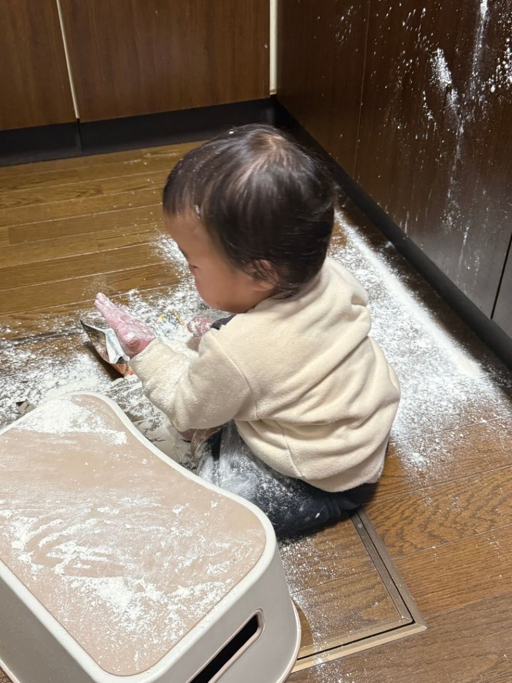 どうやら、小麦粉を入れていた引き出しを勝手に開けて取り出し、袋をひっくり返して遊んでいたようです。