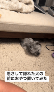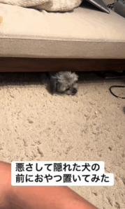 悪さをしてベッドの下に隠れていた愛犬が、おやつにつられて出てきますが…