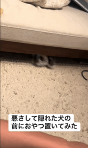 「それで、ソファの下に隠れたので、出てくるかもと思っておやつを置いたんです」と、撮影前の出来事を説明してくれました。