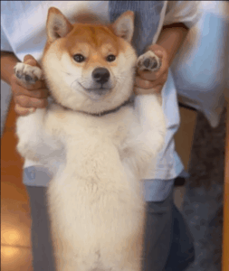 ルーカスくんにバンザイの格好をさせても落ち着いています。予想に反して、穏やかな性格のワンちゃんになっていました。