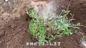 別の方法として、土を15cmほど掘り、雑草を埋める方法もあります。先ほどと同じように米ぬかをまぶし、土で覆っていき、土の乾燥を防ぐために不織布を被せれば完成です。