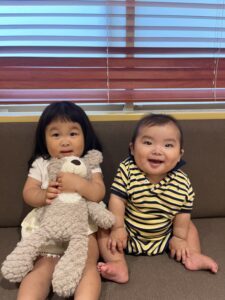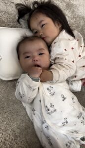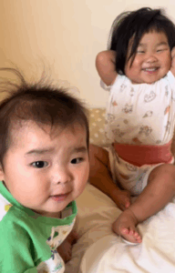 動画は、当時1歳10ヶ月のお姉ちゃんが、生後7ヶ月の弟くんに起こされるところから始まります。