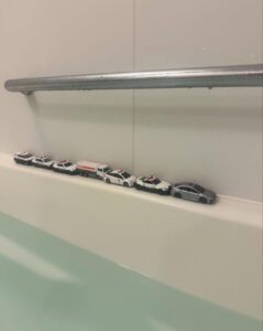 浴槽の縁にずらりと並べられたミニカーたち。これは、3歳になる息子さんが遊んだ名残だといいます。