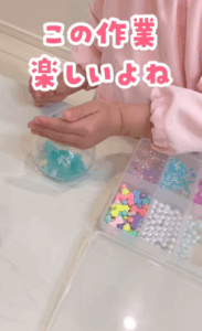 ビーズやラメを入れる工程では「どれにしようかな?」と選ぶ楽しさもあり、大興奮で制作に取り組んでいたそうです。