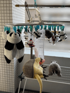 ベランダには、たくさんのぬいぐるみたちが干されています。暑い日だからこそはかどる“一仕事”は、ぬいぐるみの洗濯だったようです。