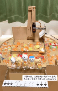 それはゲームセンターによくあるゲームで、お菓子を回転するレーンからクレーンで台の上に移動させ、台の上のお菓子を溢れさせて下に落とし、それを持ち帰ることができるタイプのゲームです。