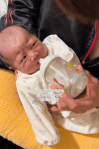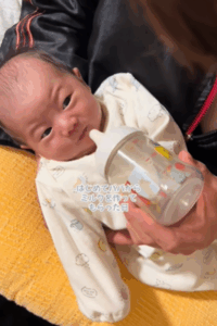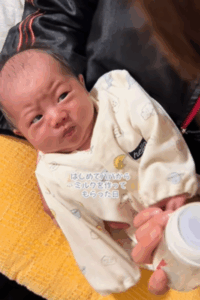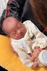 初めてパパさんがミルクを作って飲ませた日で、記念に撮影したのだとか。
