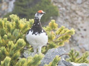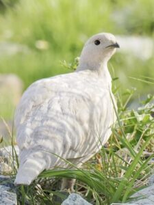 目撃情報のあった場所まで登山して向かうと、岩の上にたたずむ白変種の雷鳥に出会うことができました。