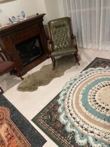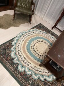 そんなラグのこだわりポイントについて「アンティーク調のインテリアを集めるのが趣味で、グリーンに統一した部屋の雰囲気に溶け込むよう、一段編むごとに設置場所に置いてみました。ラフになりすぎず、あまり甘くなりすぎず、模様を変えて編みました」と教えてくれました。