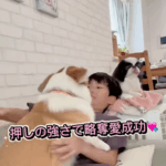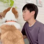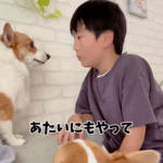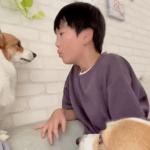息子さんとコーギーたち(@cocofamilyさんより提供)