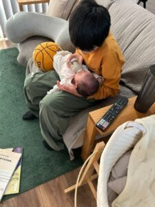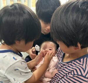 妹さんはお兄ちゃんたちの抱っこでもニコニコしたり、お兄ちゃんたちの遊んでるところをじっと見たりと、お兄ちゃんたちが大好きなようです。