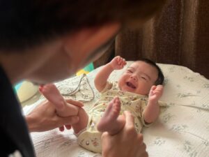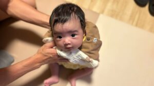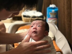 げっぷをさせるときは、されるがままで笑顔を見せてくれることが多いという娘さん。飲み方が上手くいかないときはしかめっ面をすることもありますが、ここまでの顔は初めてだったとのこと。