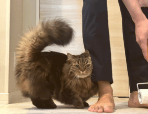 床掃除をしていると、足元にぴったりと寄り添ってくる愛猫。そんな愛らしい光景に、多くの猫好きが心を奪われることでしょう。