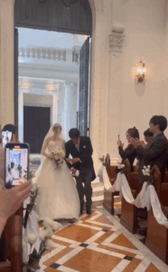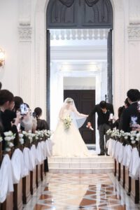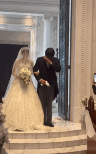 バージンロードに立ち、娘さんから肩をたたかれてもなお、涙があふれて止まらない様子のお父さん。少しして落ち着くと、娘さんから腕を組んでバージンロードを歩き始めました。